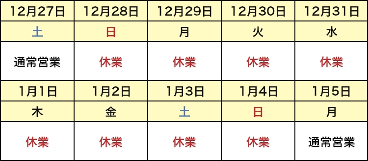 年末年始の休業について 2025年11月9日 最終更新日時 : 2025年11月9日 athome-yakkyoku 令和7年~令和8年の年末年始は下記の通り休業させて頂きます。 令和8年1月5日(月)より通常営業致します。 ご迷惑をお掛けいたしますが、何卒ご理解のほどよろしくお願いいたします。